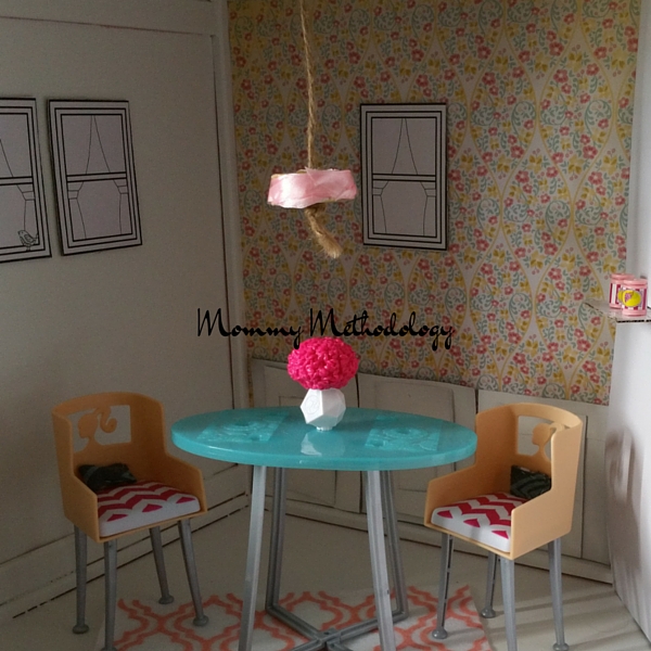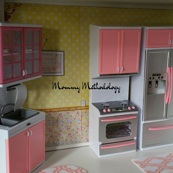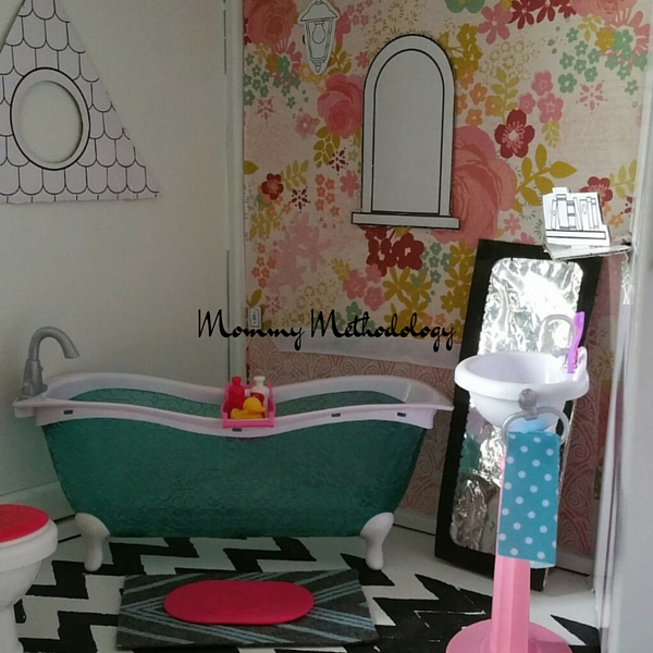 Since they play so roughly with their toys, I don’t have to worry that a more finely executed, detailed dollhouse would get ruined. And I’m super excited that I was able to repurpose the girls broken down cardboard dollhouse that would have just been thrown into the recycle bin otherwise.