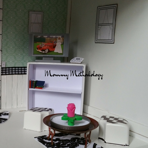 All floors of the dollhouse are open, they lack room dividers or partitions. Rather than cut and paint wood for walls, I decided to utilize the floors from the girl’s cardboard dollhouse as room partitions. Placed vertically, they are the perfect height to wedge into the top floor and middle floor of the dollhouse. This allowed me to make multiple rooms for each of those floors. The partition only extends marginally into the room which actually gives the girls more play area on each floor since the front of the dollhouse is somewhat enclosed.
